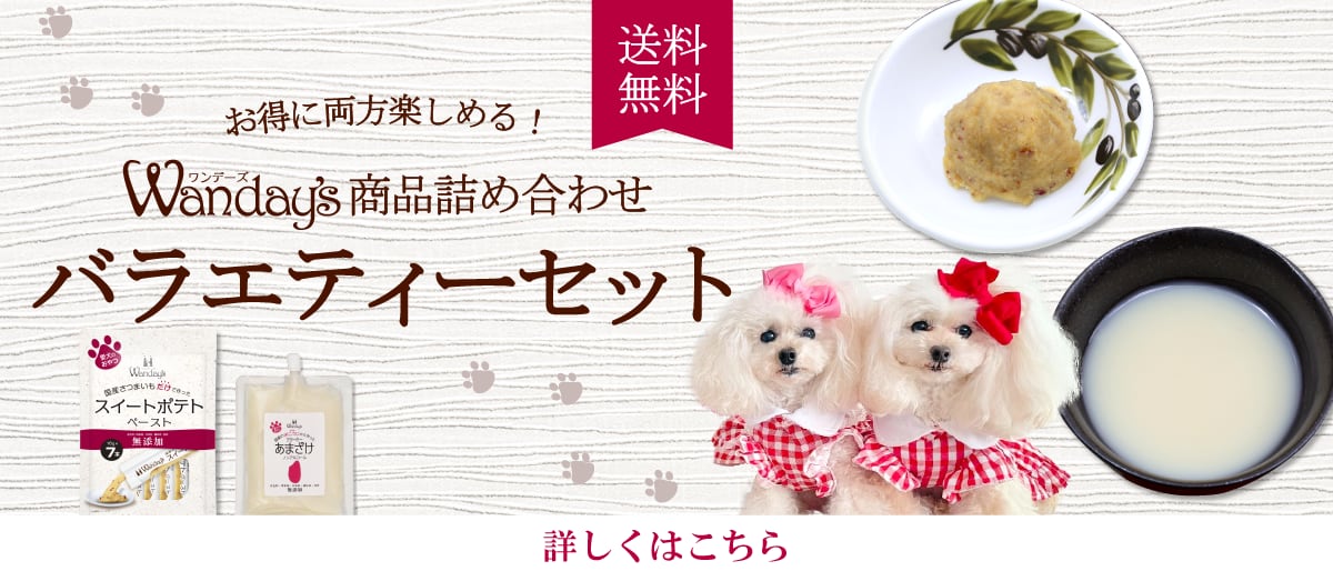 「スイートポテトペースト」と「あまざけ」をまとめてお得に楽しみたい方におすすめ! 【セット内容】 ・Wanday'sスイートポテトペースト7本入り:6p ・クリーミーあまざけ:2p ・おまけ:スイートポテトペースト2本 ----------スイートポテトペースト--------- 国内製造 国産有機(オーガニック)さつまいもだけで作った愛犬のおやつ 【送料無料】スイートポテトペースト(7本入り)8パックセット 素材そのままの味わいで愛犬も大満足! 衛生基準の高い工場で製造しています 賞味期限:製造日より18カ月 ------------------------------------------ -----------クリーミーあまざけ------------ 国内製造 国産米こうじから作った愛犬のおやつ 口当たりよく米麹のつぶを丁寧にすりつぶした飲みやすいクリーミーな味わい 無加糖・ノンアルコール 国産お米だけを使い、無添加なので、飼い主様も安心。 賞味期限:製造日より6カ月 ------------------------------------------ どちらも衛生基準の高い工場で製造しています。 お友達へのギフトにもおすすめです! ※写真はイメージです。商品デザインは予告無く変更する場合があります。